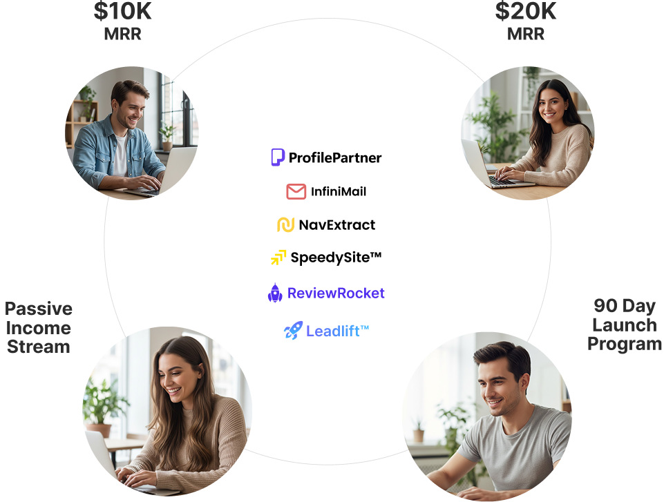 You can license proven agency or SaaS models, use our done-for-you fulfillment services, or resell tools like ProfilePartner, NavExtract, InfiniMail, and LeadLift to your own clients for recurring income.